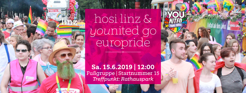 Die HOSI Linz geht gemeinsam mit der Jugendgruppe younited als Fußgruppe mit der Startnummer 15 beim EUROPRIDE mit.