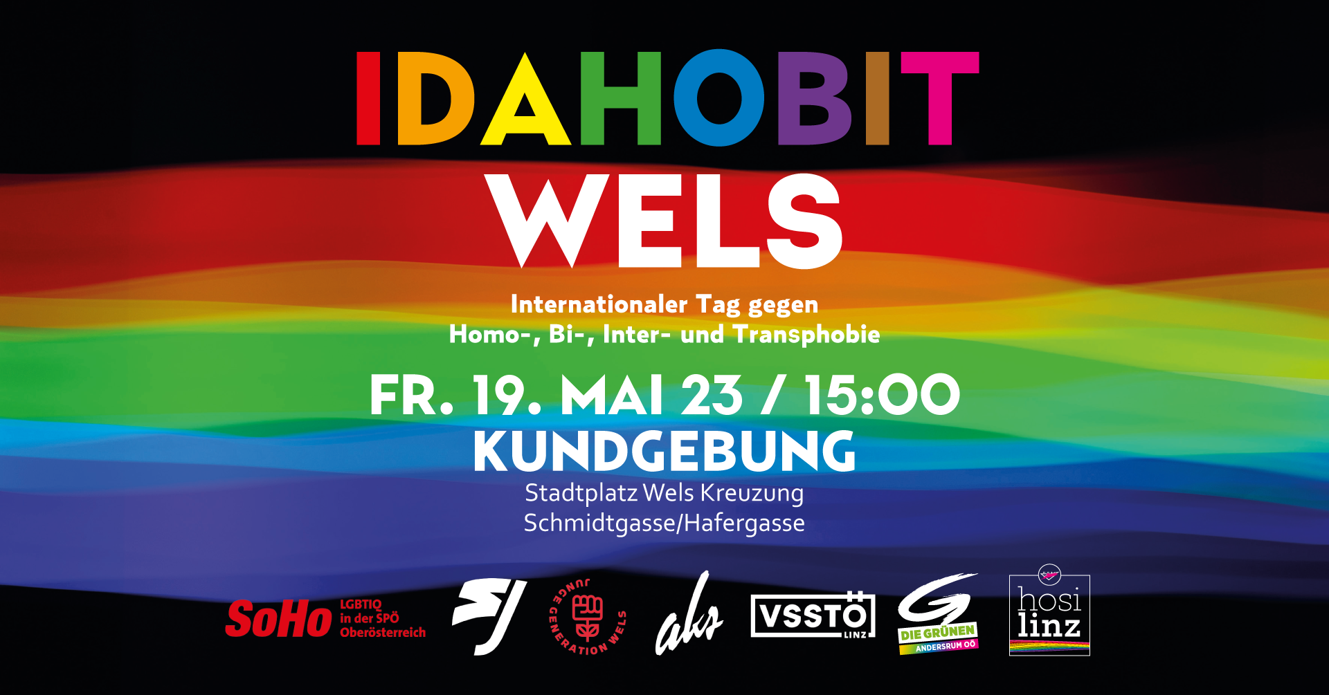 Wie auch letztes Jahr gibt es auch heuer wieder eine Kundgebung zum IDAHOBIT in Wels. Denn auch Wels ist bunt, auch wenn es der FPÖ bzw. dem Bürgermeister nicht passt.