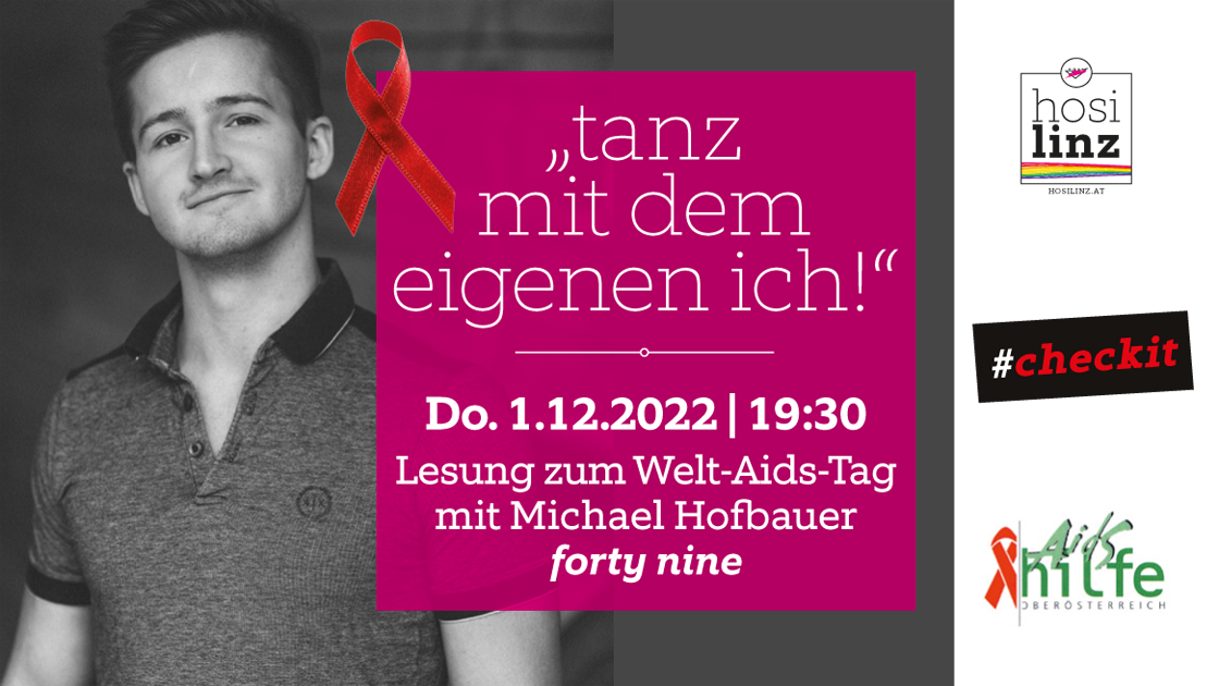 Zum Welt-Aids-Tag am Donnerstag, 1. Dezember, findet eine Weltpremiere statt. Michael Hofbauer, der vor mittlerweile 2 ½ Jahren mit einer mutigen Videobotschaft seine HIV-Diagnose öffentlich gemacht hat, liest erstmals aus seinem Buch „Tanz mit dem eigenen Ich!“. Die Lesung ist als Hybrid-Veranstaltung geplant.