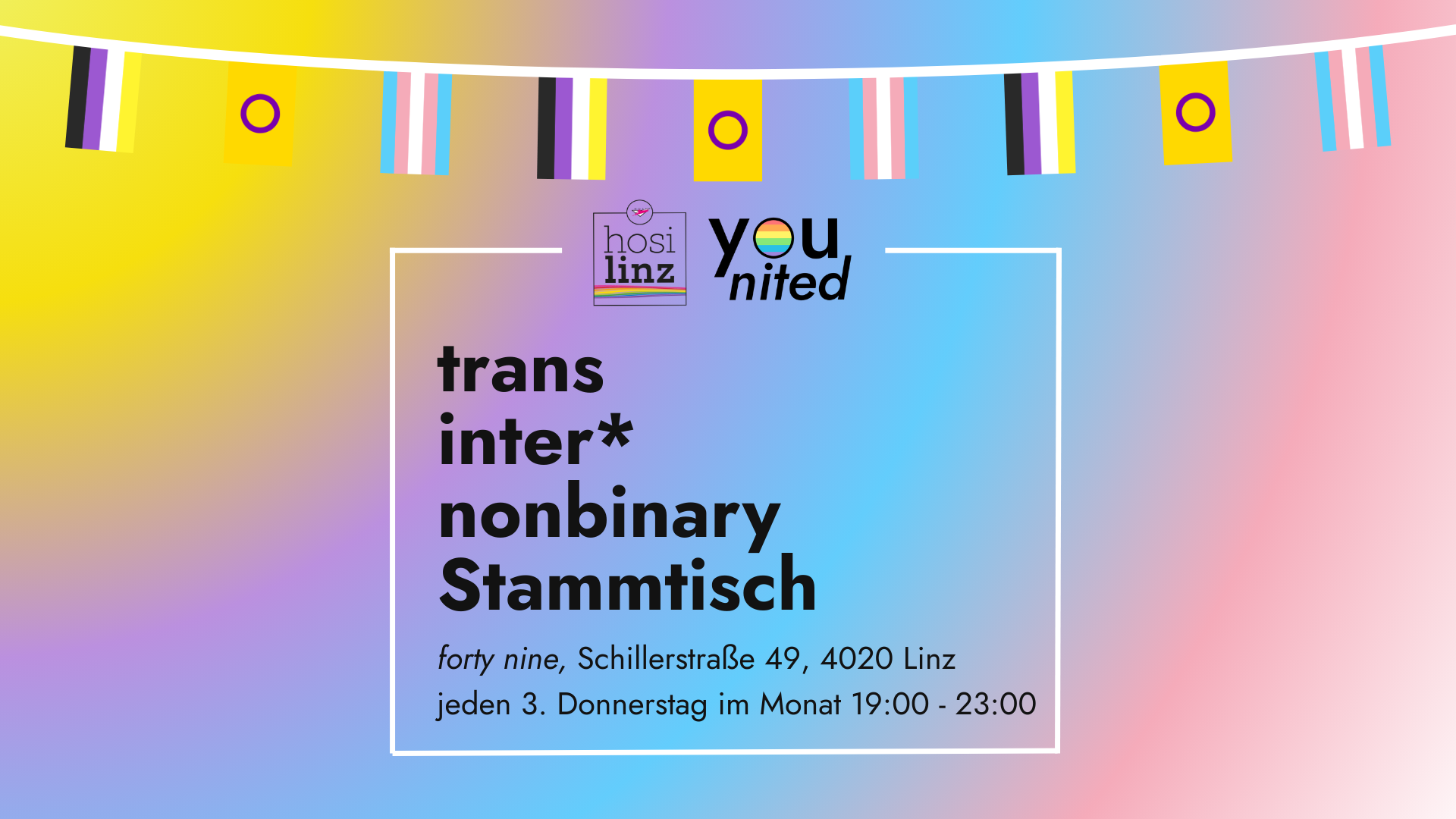 Der trans inter* nonbinary Stammtisch findet jeden 3. Donnerstag ab 19:00 im forty nine statt.