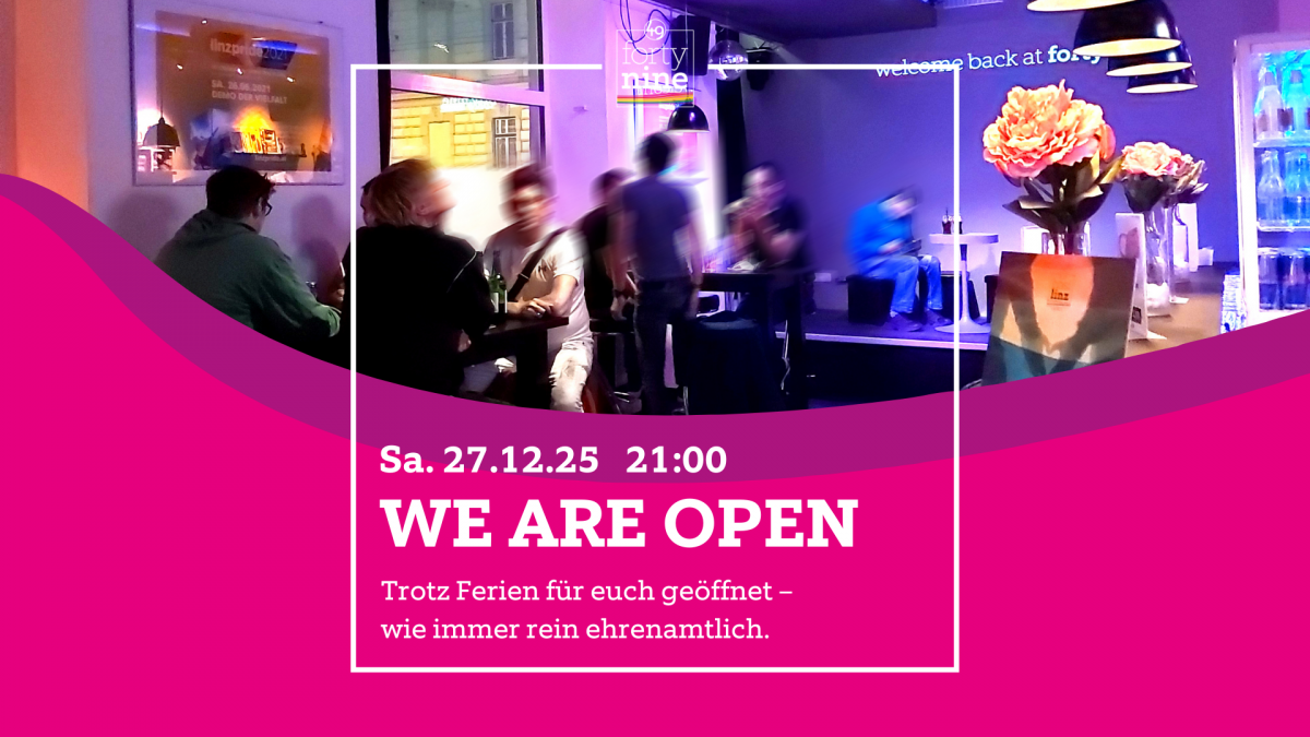 Der Termin eignet sich gut für alle, die über die Feiertage nach Linz kommen. Perfekte Gelegenheit, sich mit Freund*innen zu treffen und die ruhige Atmosphäre im forty nine zu genießen. Natürlich sind alle herzlich willkommen.