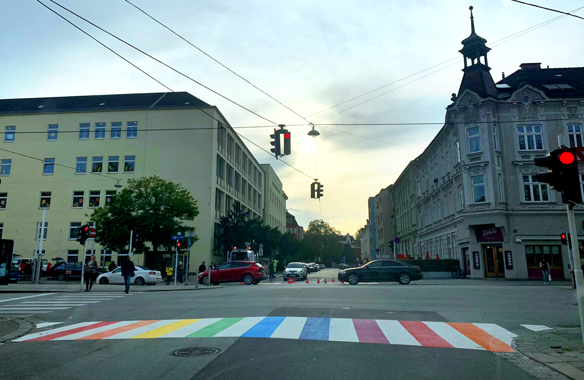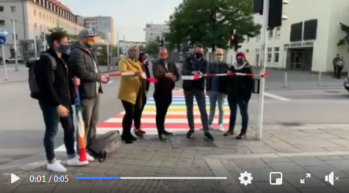Hurra! Wir präsentieren den ersten Linzer Regenbogenzebrastreifen! Pädagogisch wichtig platziert vor der Herz-Jesu-Kirche und der Otto-Glöckl-Schule an der Wiener Straße. Wir bedanken uns herzlich bei den Grünen Linz für die Initiative, dem Linzer Gemeinderat und den mit der Umsetzung befassten Mitarbeiter*innen des Magistrats.