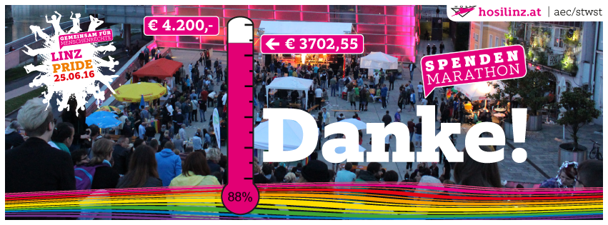 Am 25.06. soll heuer LINZ PRIDE 2016 auf dem Maindeck des Ars Electronica Center über die Bühne gehen. Diese Veranstaltung kostet einiges an Geld – wir rechnen insgesamt mit etwa 15.000 Euro.