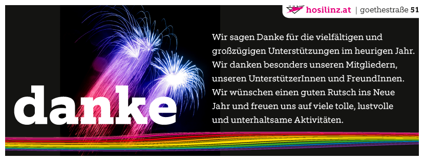 Wir sagen Danke für die vielfältigen und großzügigen Unterstützungen im heurigen Jahr. Wir danken besonders unseren Mitgliedern, unseren UnterstützerInnen und FreundInnen. Wir wünschen einen guten Rutsch ins Neue Jahr und freuen uns auf viele tolle, lustvolle und unterhaltsame Aktivitäten.