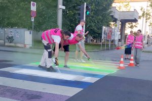 Vor ein paar Tagen haben ein paar völlig durchgeknallte Leute den Regenbogen-Zebrastreifen an der Kreuzung Wiener Straße – Lissagasse mit homophoben Parolen beschmiert. Die Community griff zur Selbsthilfe und hat die Schmierereien entfernt.