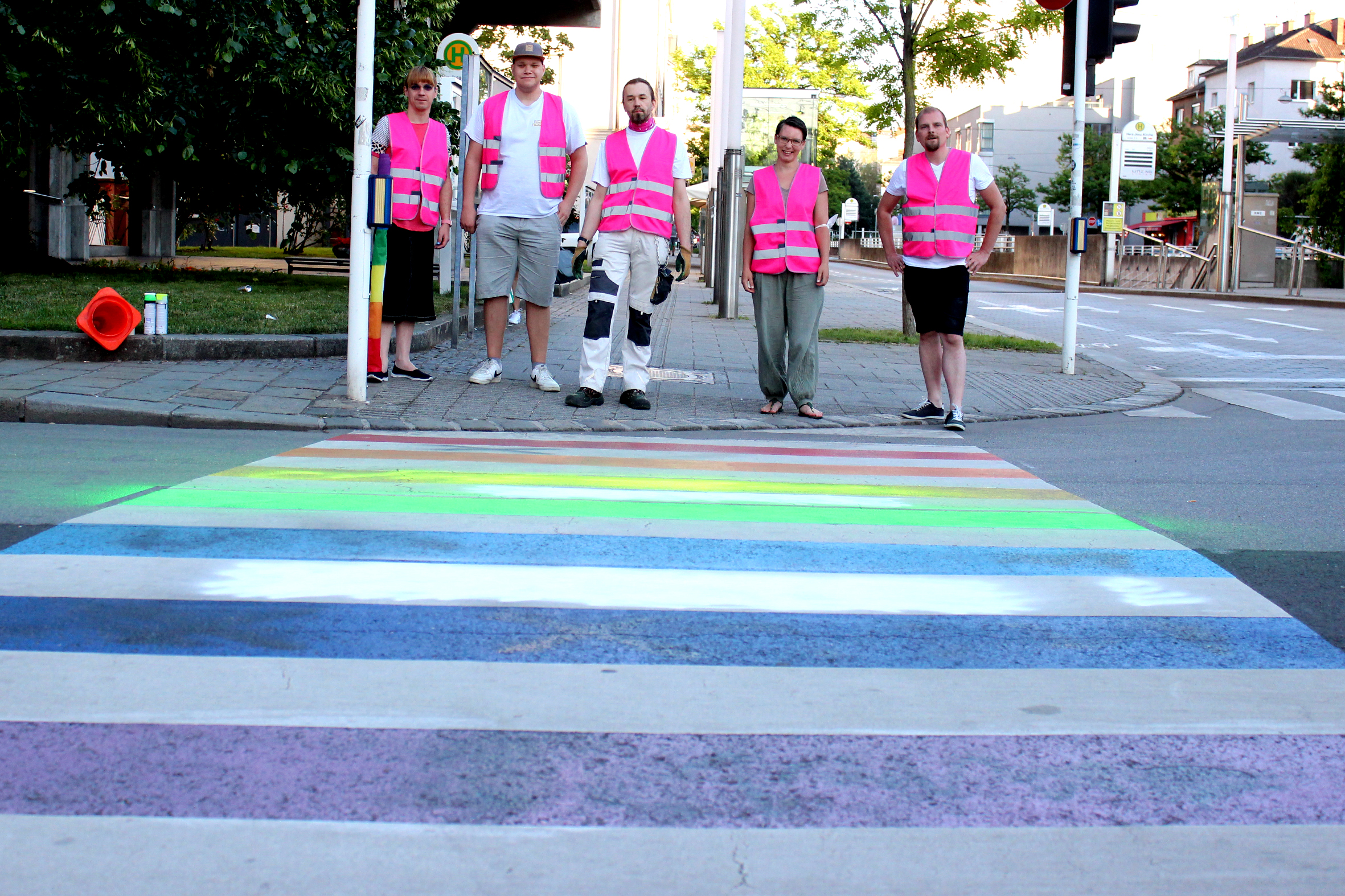Vor ein paar Tagen haben ein paar völlig durchgeknallte Leute den Regenbogen-Zebrastreifen an der Kreuzung Wiener Straße – Lissagasse mit homophoben Parolen beschmiert. Die Community griff zur Selbsthilfe und hat die Schmierereien entfernt.