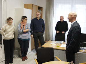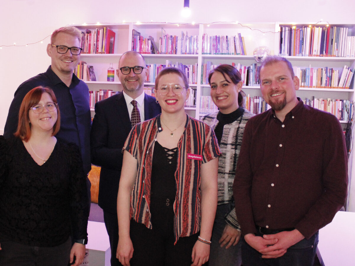 HOSI Vorstand (Weiland, Müller, Pachinger, Banasik) mit Prammer und Blöchl – Communityraum/Bibliothek
