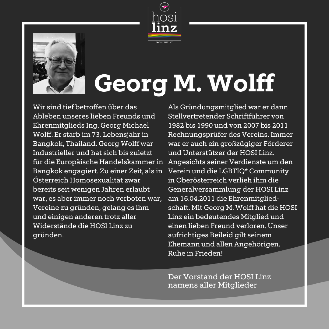 Wir sind tief betroffen über das Ableben unseres lieben Freunds und Ehrenmitglieds Ing. Georg Michael Wolff. Er starb im 73. Lebensjahr in Bangkok, Thailand. Georg Wolff war Industrieller und hat sich bis zuletzt für die Europäische Handelskammer in Bangkok engagiert. Zu einer Zeit, als in Österreich Homosexualität zwar bereits seit wenigen Jahren erlaubt war, es aber immer noch verboten war, Vereine zu gründen, gelang es ihm und einigen anderen trotz aller Widerstände die HOSI Linz zu gründen.