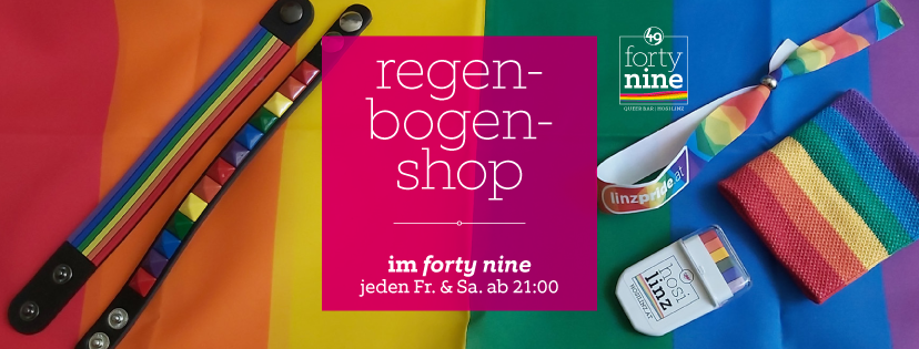 Mehr als 40 Produkte: Regenbogenfahne mit Stab klein, 10 x 15 cm oder gross 30 x 45 cm, diverse Regenbogenaufkleber, Pins als Red Ribbon, Rosa Winkel, Frauen- oder Männerzeichen, Regenbogen-Armband (Silikon) oder Regenbogen-Schweißband (Frottee), Red Ribbon-Schlüsselband, Regenbogen-Handtuch oder Regenbogen-Badetuch, Leder-Armband in Regenbogenfarben, Silikon-Armband mit Streifen in Regenbogenfarben, Solibänder LINZPRIDE oder Fanbrush Regenbogenschminke, uvm.