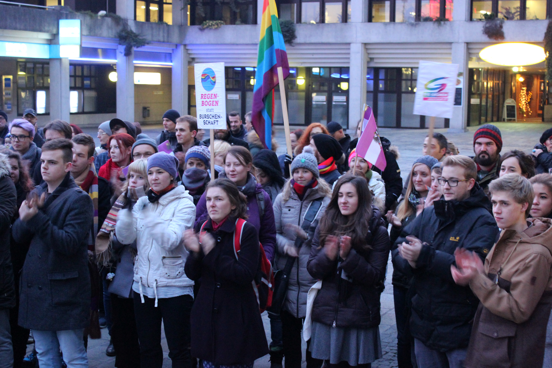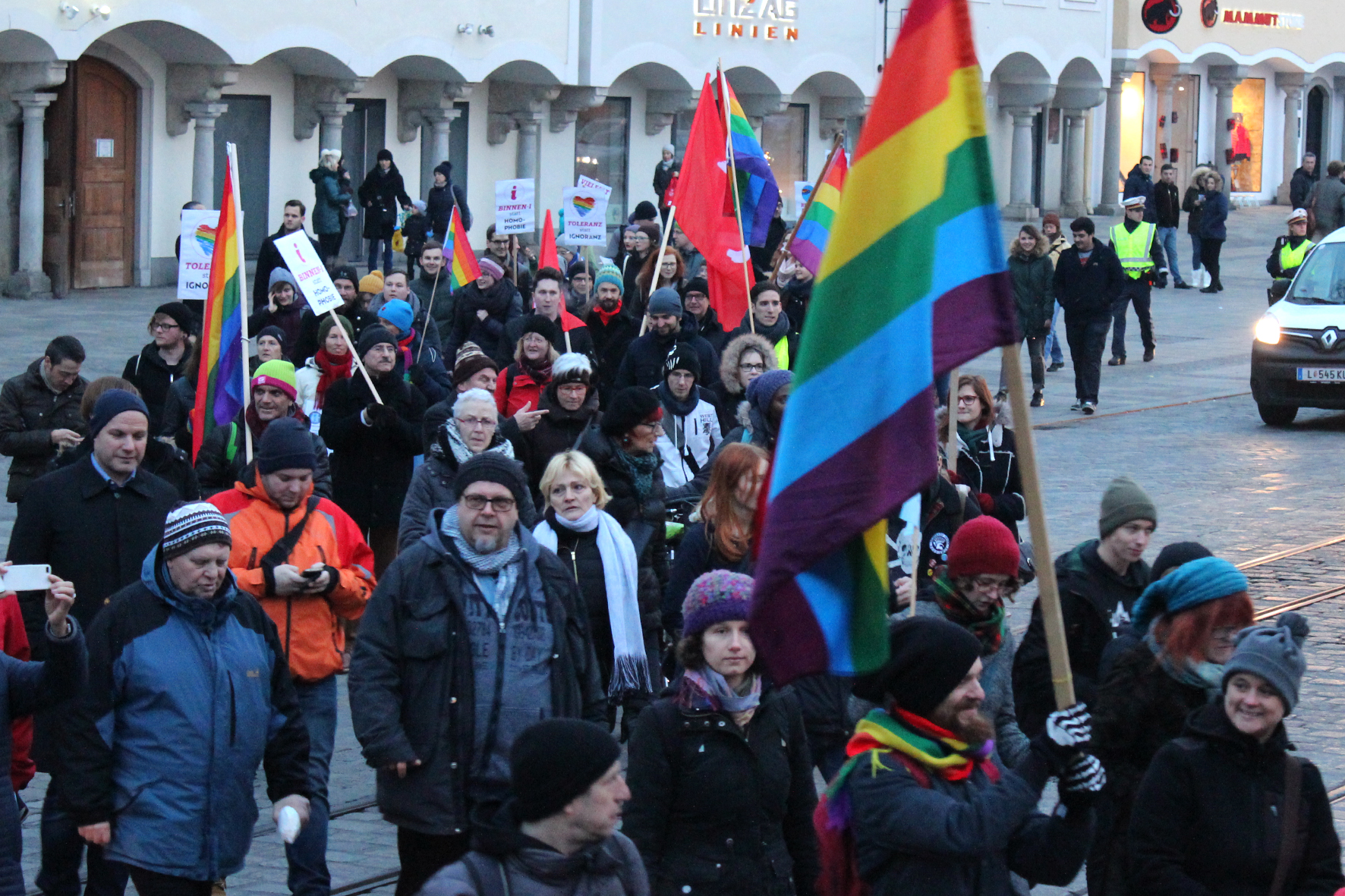 HOSI Linz, Grüne Andersrum OÖ, SoHo OÖ, SJ Linz und Grüne Linz  setzten gemeinsam ein Zeichen gegen die homophobe Politik der Linzer FPÖ und für Weltoffenheit und ein respektvolles Miteinander in Linz. Demo am Freitag, den 11.12.2015 um 15:30 Uhr von der Mozartkreuzung in Linz über die Landstraße zum Neuen Rathaus.