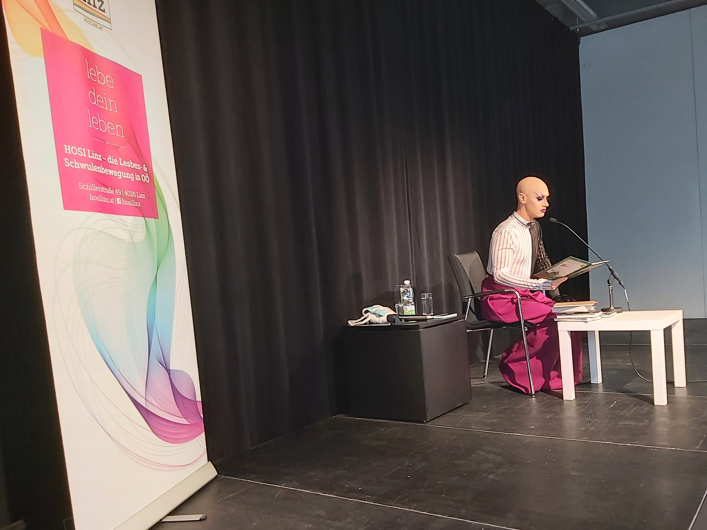 Die Lesung hatte ein vielfältiges Programm von Belletristik bis hin zu historischer Bildung. Nach drei Kindergeschichten las Dragqueen Cherry T Joystick Ausschnitte aus „Heldensommer“, „Die sieben Männer der Evelyn Hugo“, „Franz. Schwul unterm Hakenkreuz“ und „Dorothea. Queere Heldin unterm Hakenkreuz“. Müller bemerkt: „Wir bedanken uns beim Offenen Kulturhaus, das diese Lesung im Rahmen der Ausstellung ‚Queer‘ ermöglicht hat, und freuen uns sehr, dass dieses Bildungsangebot so gut angenommen wurde. Das bestätigt unsere Arbeit für LGBTIQ*-Menschen in Oberösterreich einmal mehr. Und den politischen Glücksritter*innen empfehlen wir, insbesondere sich mit dem Kontext der letzten beiden Bücher zu befassen.“
