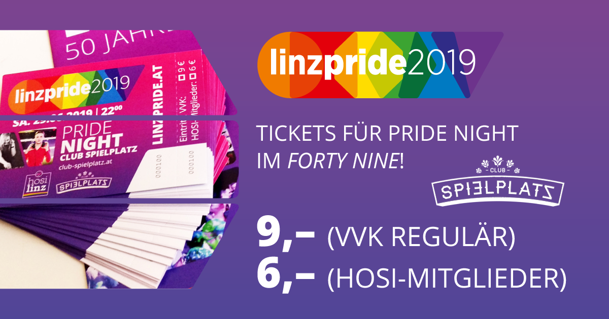 Vorverkaufskarten für die PRIDE NIGHT Club Spielplatz sind im forty nine und in der Blue Heaven Bar (HOSI-Mitglieder nur im forty nine!!) erhältlich! Jetzt jeden Freitag und Samstag bis einschließlich Freitag, 28.06.2019!