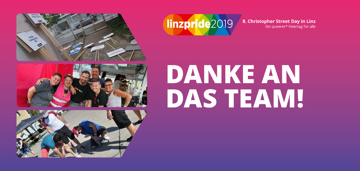 Vorstand und Organisationsteam des linzpride 2019 bedanken sich ganz herzlich bei all jenen, ohne die diese Veranstaltung gar nicht möglich gewesen wäre, nämlich dem Team vor Ort! Hätte es euch nicht gegeben, euren Einsatz, euren Fleiß und eure Begeisterung, wir hätten dieses Event nie stemmen können! Danke daher an