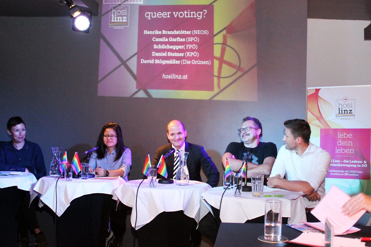 Vor den Wahlen zum Nationalrat lud die HOSI Linz Vertreter*innen der bundesweit kandidierenden Parteien zu einem Podiumsgespräch ins HOSI-Zentrum ein – zum ersten Mal in die Schillerstraße 49.