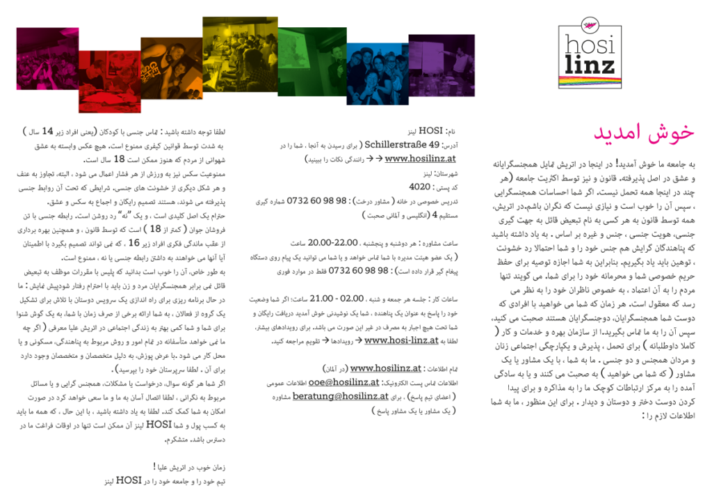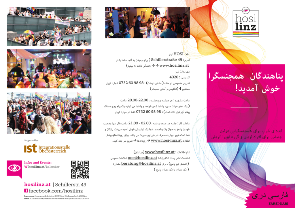 ساعات کار : جلسه هر جمعه و شنبه ، 21.00 – 02.00 ساعت؛ اگر شما وضعیت خود را پاسخ به عنوان یک پناهنده ، شما یک نوشیدنی خوش آمدید دریافت رایگان و شما تحت هیچ اجبار به مصرف در غیر این صورت می باشد. برای رویدادهای بیشتر، لطفا به www.hosi-linz.at → رویدادها → تقویم مراجعه کنید.