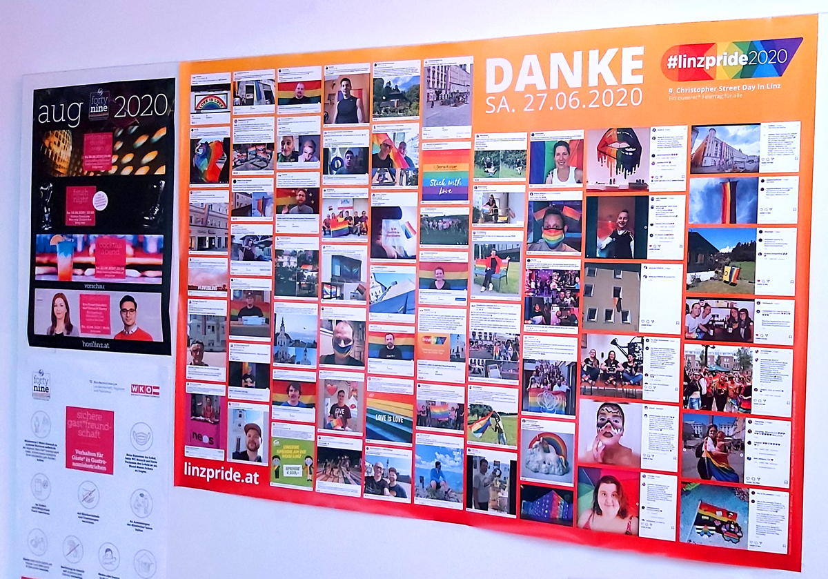Alle Postings mit #linzpride2020 auf Facebook und Instagram auf einem Plakat